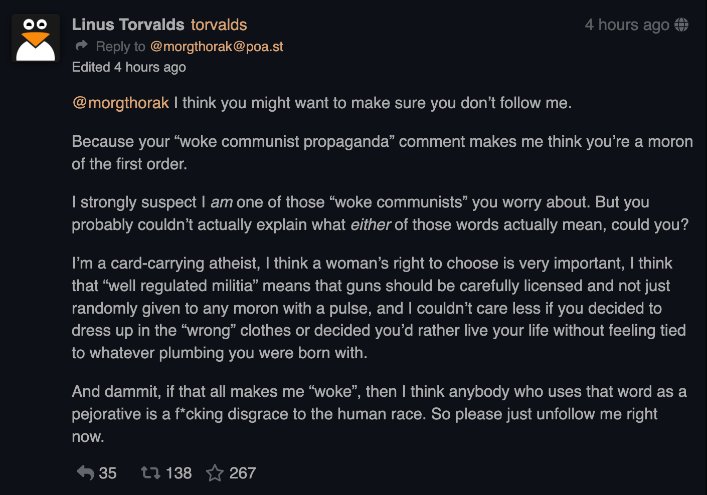 Linus Torvalds -- Creator of Linux -- defends gun regulation, woke communists, womens rights AND trans rights. Linux is political!