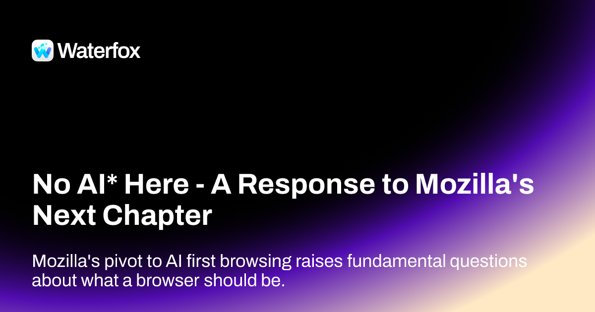 Nutomic@lemmy.ml to Privacy@lemmy.mlEnglish · 3 months agoNo AI* Here - A Response to Mozilla's Next Chapter - Waterfox Blogwww.waterfox.comexternal-linkmessage-square8fedilinkarrow-up1131arrow-down11cross-posted to: firefox@lemmy.ml
