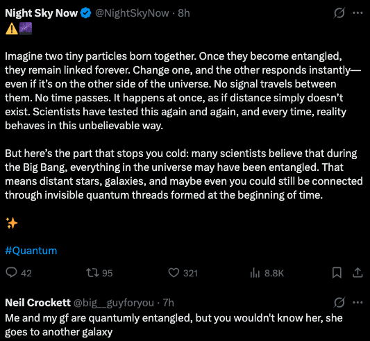 You rip a photograph in half and put both halves into envelopes. Now you send one of the envelopes to your friend in Australia. You open the other envelope. Boom! Instantaneous knowledge of what’s in the envelope in Australia. Faster than light!!!