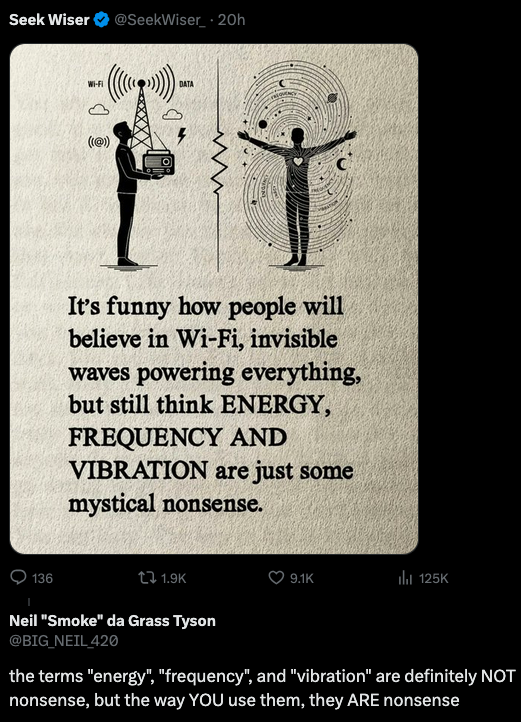 The implication in the meme that anyone who is using these terms cannot be indulging in mystical nonsense, because these terms can also apply to real things. In fact, though, mystic cranks have been coopting scientific terms for ages, and they show no signs of slowing down. It’s a real problem that people confuse crap with science.