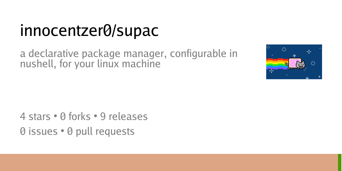 Ah yes, I came across this when someone else pointed it out as well. The project looks neat, ngl. supac also shares some goals along these lines, but dcli looks more mature. I still prefer supac (it’s my project duh) because supac allows you to script in nushell, which lets you do interactive development (if you use nushell as your shell, which you absolutely should!). I also don’t prefer something like YAML for config, but since it’s extensible with lua, I guess it makes sense to go with a config language as well. I do think the end goals are different, I try to orient supac to be a nix alternative but with integrated package management across different package managers. Also, supac is simpler in principle because a lot of the complexity is shifted to accompanying libs in nushell (such as systemd unit integration).