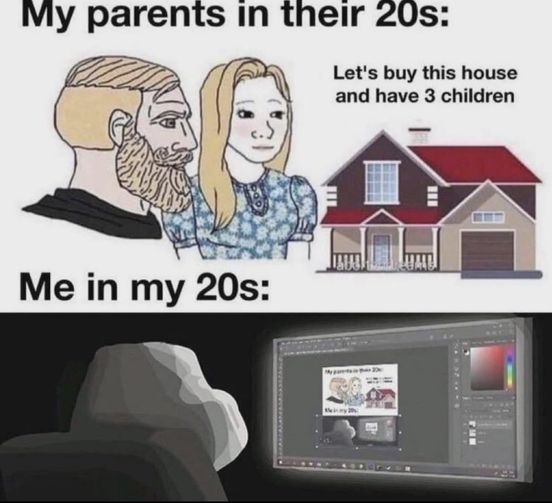For real, everyone I know in my generation is either living with their parents, sharing a rented apartment with 5 other people, or intermittently homeless.