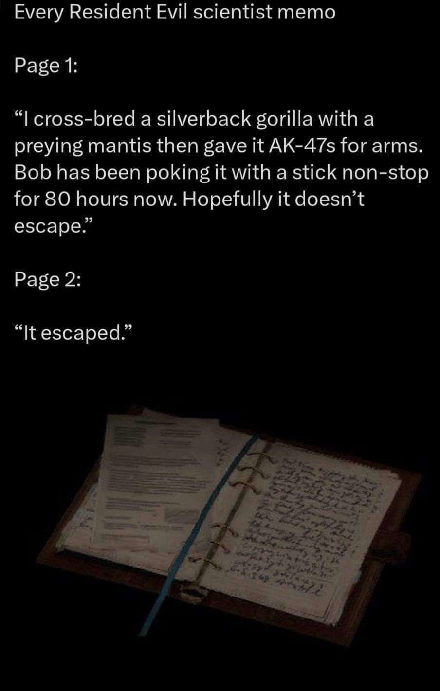 daggermoon@lemmy.worldM to Resident Evil@lemmy.worldEnglish · 2 months agoScience is just fucking around and writing down the resultslemmy.mlimagemessage-square0fedilinkarrow-up11arrow-down10file-textcross-posted to: gaming@lemmy.ml
