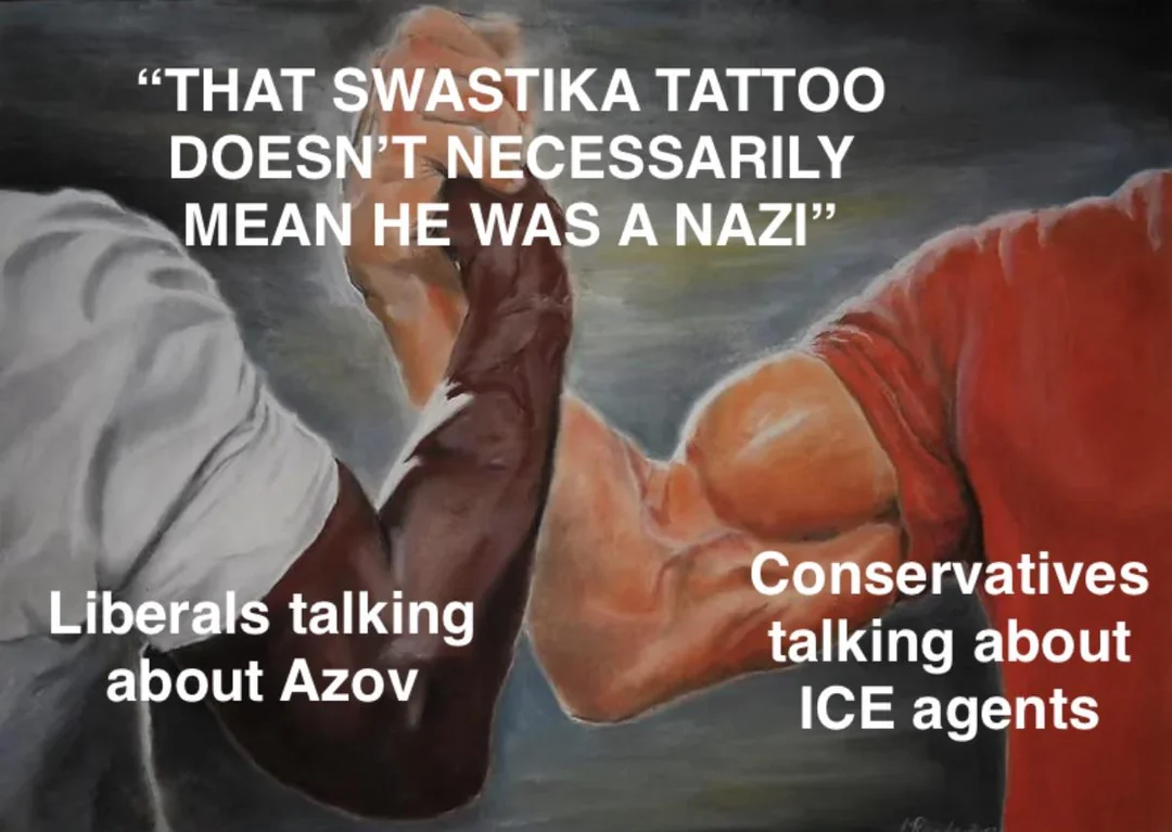 minus-squarefakasad68@lemmy.mllinkfedilinkarrow-up6·4日前Wait, why are liberals represented by the black arm? Are you implying that all liberals are black /j